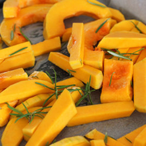3. Arrange butternut squash on baking pan. Roast until fork tender, about 25-30 minutes. Set aside.
